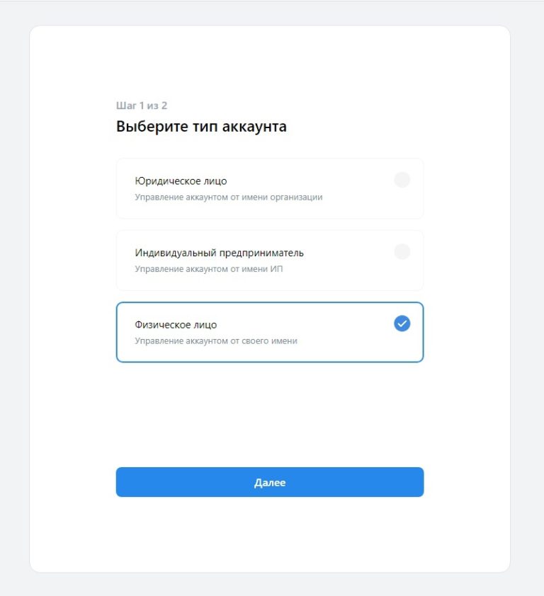 - Выберите тип аккаунта (рекомнедуем указывать физическое лицо) и нажмите кнопку «Далее».