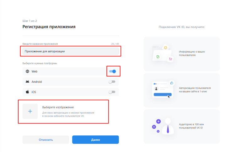- Укажите название приложение, выберите платформу Web и загрузите изображение (иконку) приложения и нажмите кнопку «Далее»