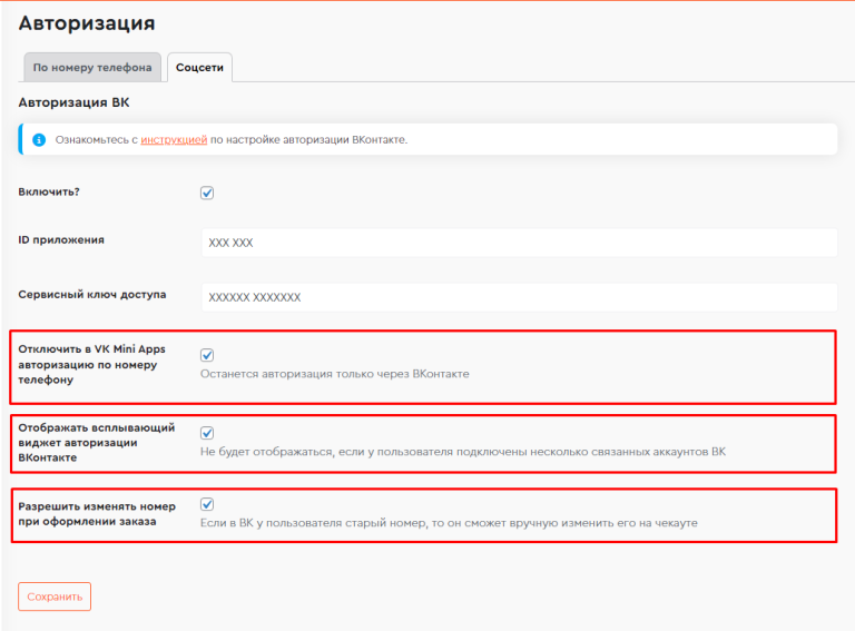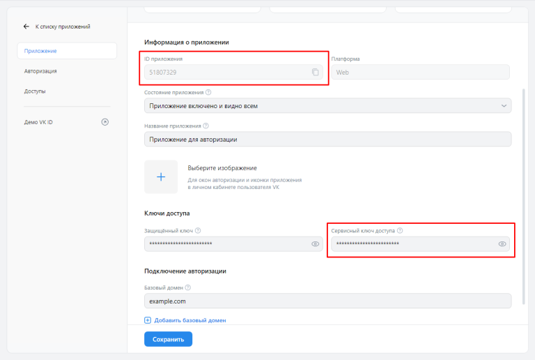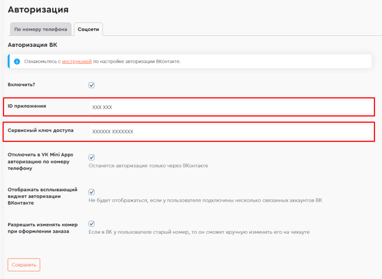 - Включите авторизацию «ВКонтакте», а также укажите «ID приложения» и «Сервисный ключ доступа». Эти данные вы можете посмотреть в настройках приложения на портале «VK ID».