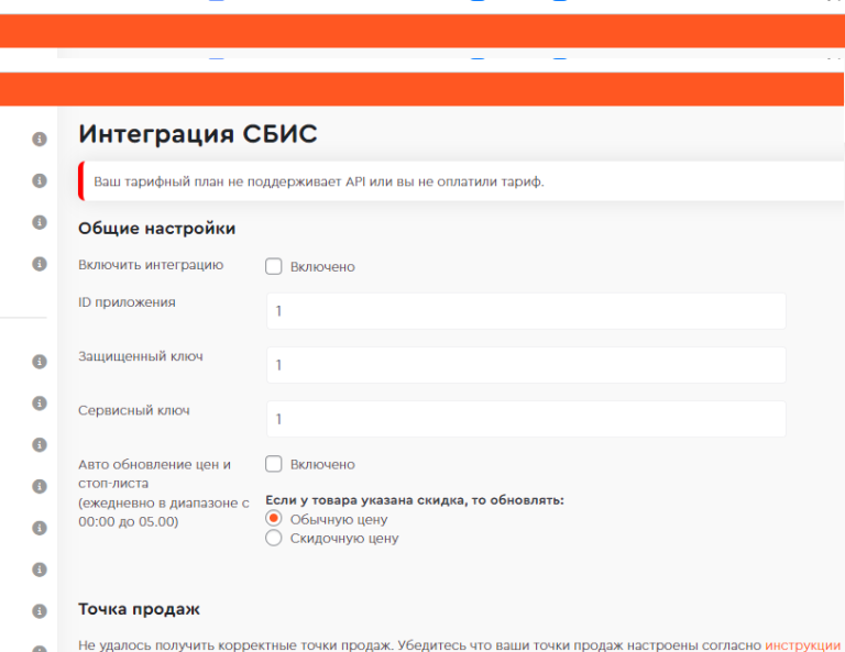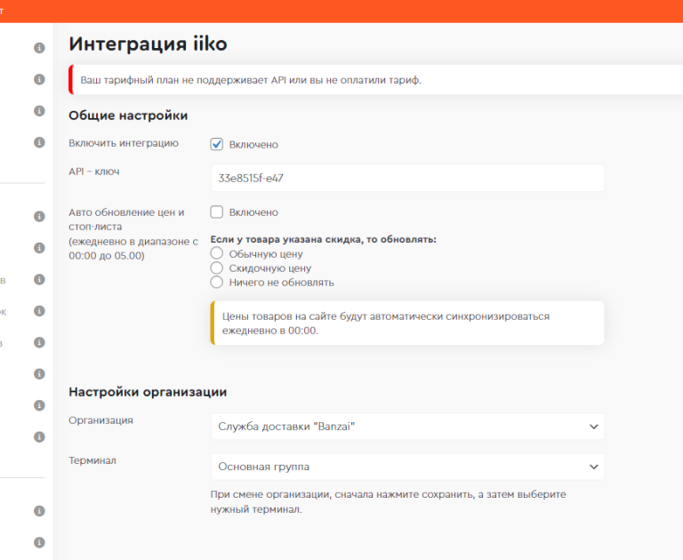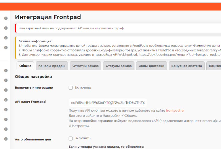 Добавили плашку, которая выводится в общих настройках, если ваш тариф в FrontPad, iiko, СБИС не поддерживает API или вы не оплатили тариф.