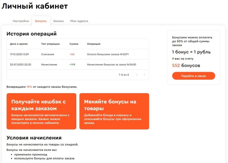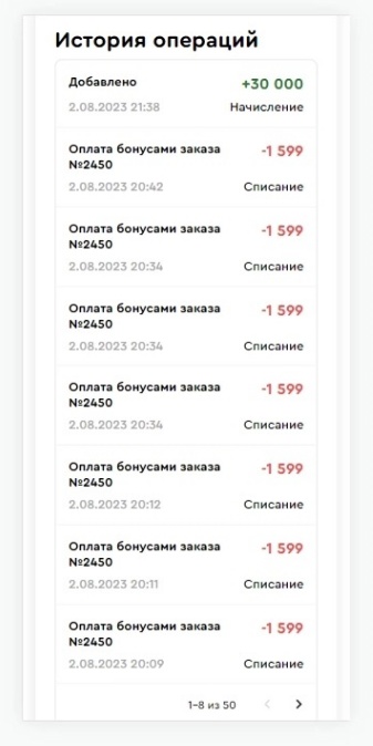 Верстку постарались сделать максимально функциональной и понятной как на десктоп, так и мобильных устройствах. На странице пользователь может видеть условия бонусной программы и историю начисления / списаний своих бонусов. Все данные для страницы (% кешбэка, сумма доступных бонусов, начисления и списания) берутся автоматически из настроек платформы.