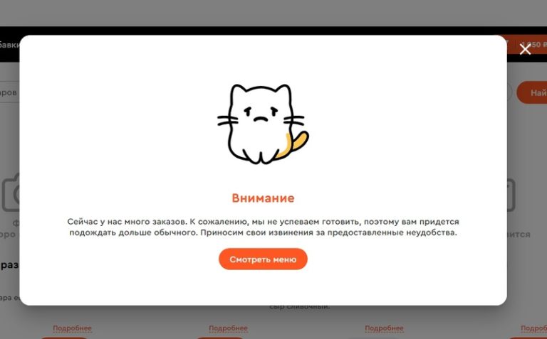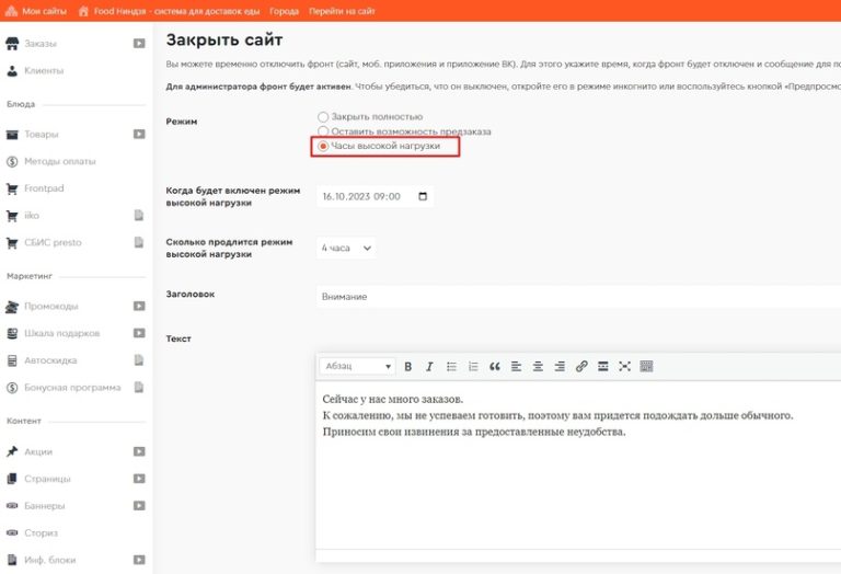 Добавлен новый режим закрытия сайта – «Часы высокой нагрузки». Если в часы пик, вы не успеваете доставлять быстро, то теперь вы можете включить отображение всплывающего сообщения при заходе пользователем на сайт и приложения (пример на слайде 2) о более длительной доставке. Текст можно написать свой.