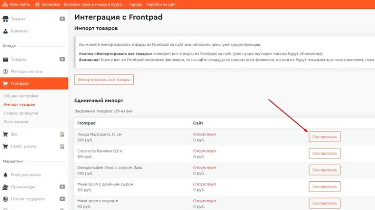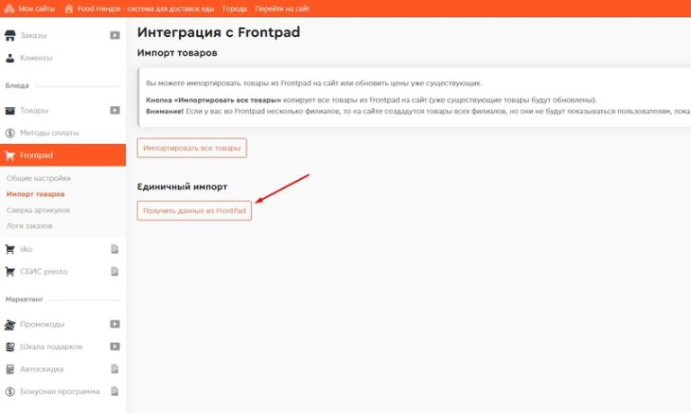 Как следствие, чтобы импортировать единичный товар, теперь сначала нужно нажать «Получить данные из Frontpad» и уже после делать импорт товаров.