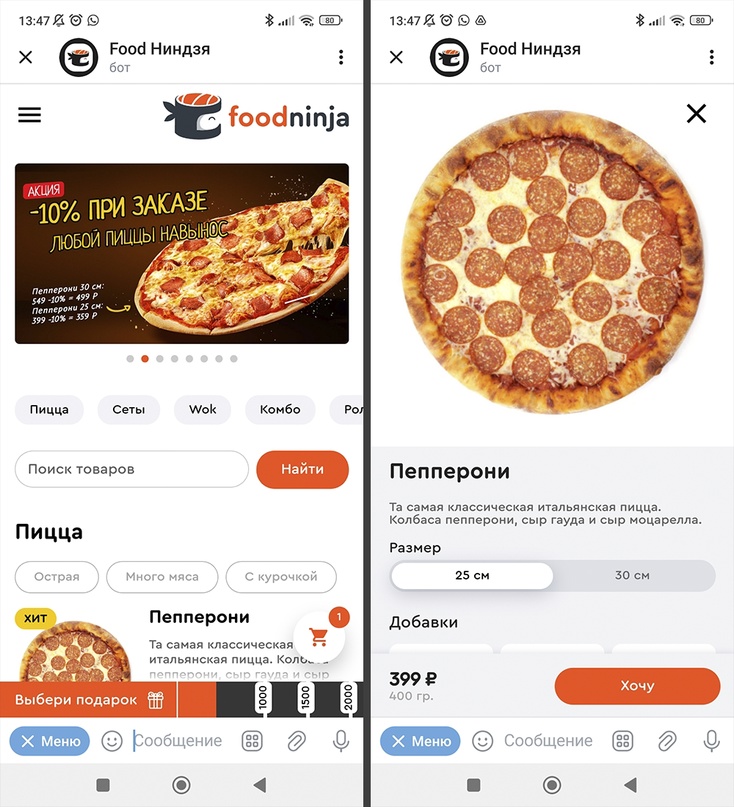 Мы сделали приложение для Telegram, и это не просто бот, это полноценный магазин внутри мессенджера. Посмотреть демо: https://t.me/food_ninja_bot