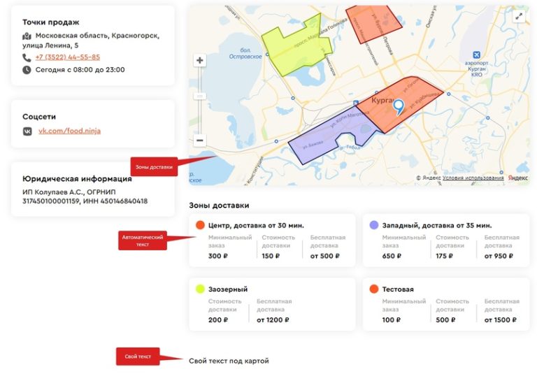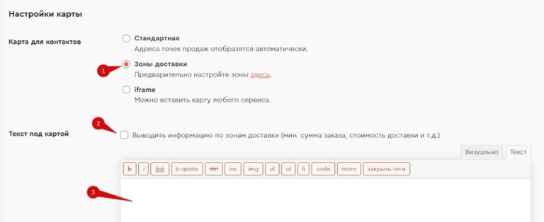 Для карты «Зоны доставки» (1) теперь можно включить или отключить вывод автоматической информации о зонах под картой. Также вы можете вывести только свой текст под картой (3) или в дополнение к автоматическому. Пример на слайде №2.
