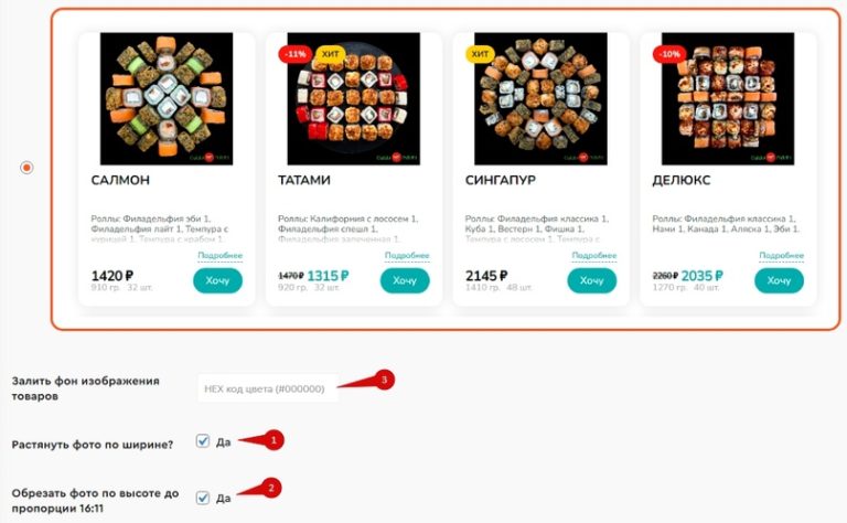 Новая опция «Обрезать фото по высоте» (2) доступна при включенном растягивании фото по ширине (1) для варианта №1 вывода товаров (надеемся мы понятно написали).