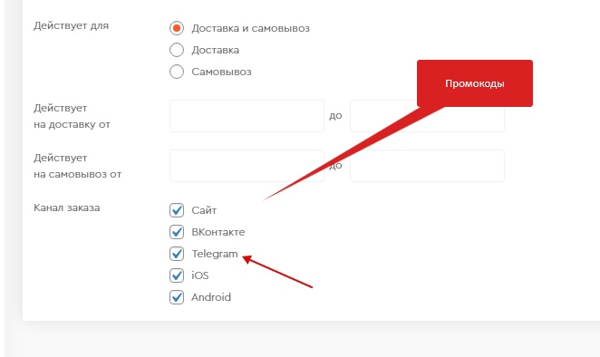 - Можно настраивать промокоды только для канала продаж Telegram.