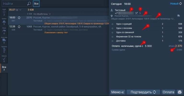 Выбранное клиентом количество персон (1) передается в отдельное поле iiko «Количество гостей», а «Сдача» (2) в комментарии к заказу, т.к. через iiko api поле «Сдача» не доступно.