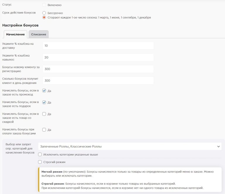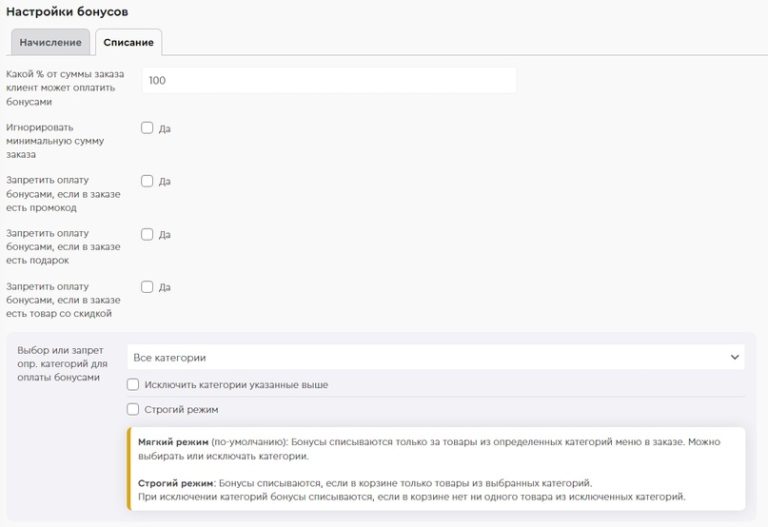 3. Выбор или запрет определённых категорий для начисления/списания бонусов;