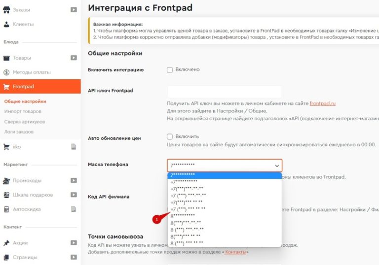 Добавлено 8 новых масок телефона для передачи во Frontpad. Мы постарались предусмотреть все возможные варианты того, какая маска может быть задана у вас в настройках Frontpad. Точное совпадение маски важно для получения данных в/из Frontpad (карта клиента, бонусы и заказы клиента). Настройка маски в Frontpad показана на 2-ом слайде.